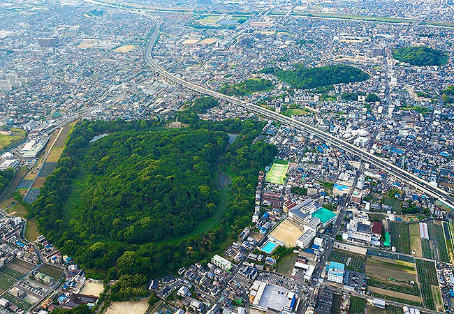百舌鳥古墳群のほぼ中央、大仙陵古墳の南、上石津ミサンザイ古墳の東に位置します。墳丘長約146メートルで、百舌鳥古墳群では8番目の大きさです。墳丘は3段に築かれ、南側に造り出しがあります。主体部の構造や副葬品などは不明。台地の南端に位置するため、周濠の南側には大規模な堤が築かれています。陪塚は数基あったとされるが、善右ヱ門古墳のみが現存しています。